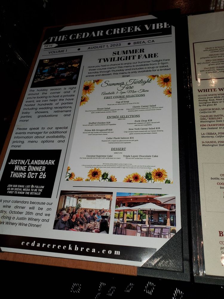 Cedar Creek Inn, located in Brea, CA, offers a menu filled with New American and Steakhouse classics. From lunch salads like the Caesar and House Salad to burgers, tacos, and sandwiches, there is something for everyone. The Angus Hamburger and Grilled Ahi Burger stand out, as well as the Ultimate BLT and Turkey Supreme sandwiches. Customers rave about the excellent service from staff like Natalie and Erika, making dining experiences memorable. The outdoor seating area is a favorite for happy hour and special events. With a cozy vibe, Cedar Creek Inn is a hidden gem with a great selection of Napa wines. Don't miss out on their special Happy Hour deals and the three-course meal offerings after 4 pm on select days for an upscale dining experience at a reasonable price.